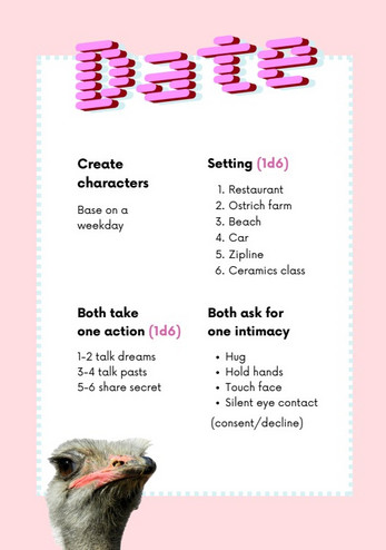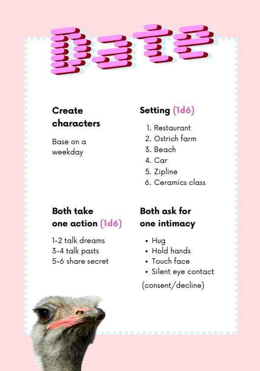 Date is a 48-word version of a dating reality show game in development. It combines TTRPG and LARP. Made for the 48-word RPG jam.